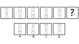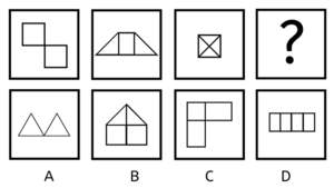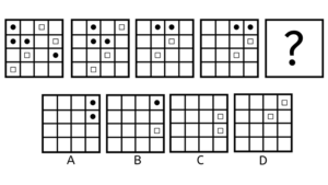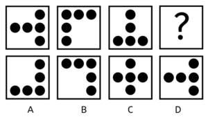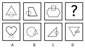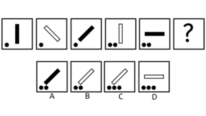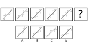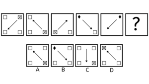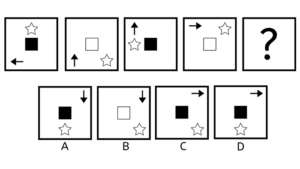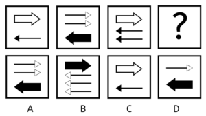 Hver boks indeholder en stor pil. Pilen er skiftevis i toppen, som en hvid pil pegende mod højre, og i bunden, som en sort pil pegende mod højre. Svaret skal altså indeholde en sort pil i bunden, pegende mod venstre. Vi kan se, at der er én lille sort pil i den første boks, men to små sorte pile i den 3. boks. Ud fra det må vi antage, at der sker en form for udvikling med antallet af små pile, dog at antallet nødvendigvis skal være stigende. Altså må svaret indeholde et antal af hvide små pile, der er forskelligt det, vi har set i forvejen. De hvide små pile skal være i toppen, og vi har set en boks med to pile, så svaret må derfor indeholde én hvid lille pil. Altså er svaret D, der indeholder én lille hvid pil, samt en stor stort pil.